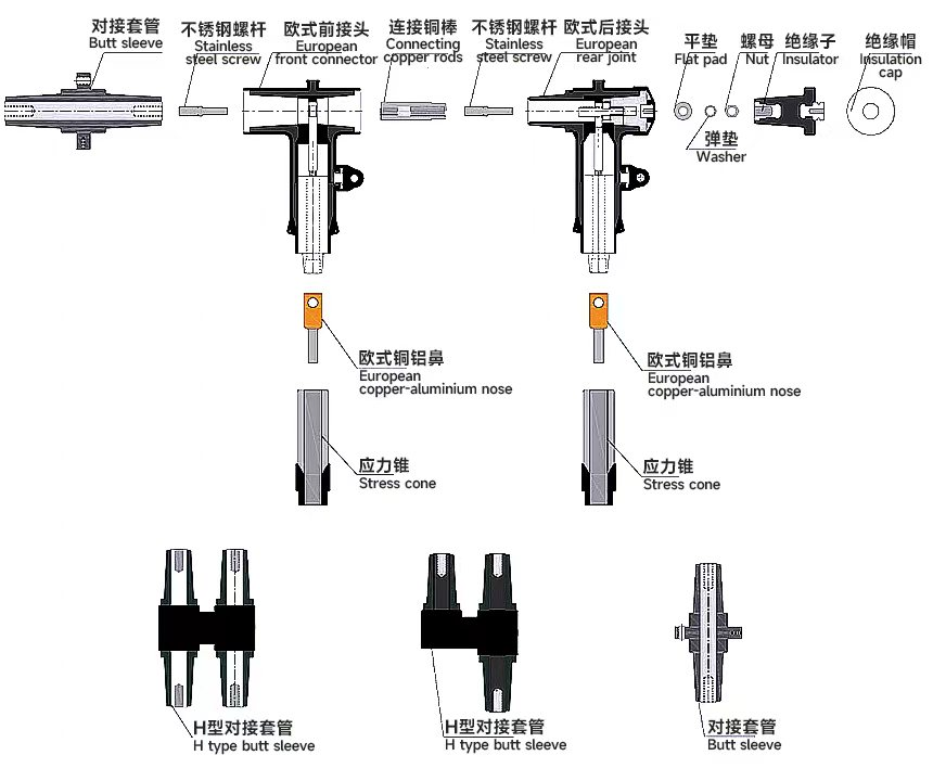 - ਸਾਰੇ ਕੇਬਲ ਜੋੜ ਕਰਾਸ-ਲਿੰਕਡ ਪੋਲੀਥੀਲੀਨ ਇੰਸੂਲੇਟਡ ਕੇਬਲਾਂ ਲਈ ਢੁਕਵੇਂ ਹਨ। 200A ਕੇਬਲ ਜੋੜ 35mm²-180mm² ਦੇ ਕੇਬਲ ਕਰਾਸ-ਸੈਕਸ਼ਨ ਵਾਲੀਆਂ ਕੇਬਲਾਂ ਲਈ ਢੁਕਵਾਂ ਹੈ; 600A ਕੇਬਲ ਜੋੜ 25mm²-500mm² ਦੇ ਕੇਬਲ ਕਰਾਸ-ਸੈਕਸ਼ਨ ਵਾਲੀਆਂ ਕੇਬਲਾਂ ਲਈ ਢੁਕਵਾਂ ਹੈ।