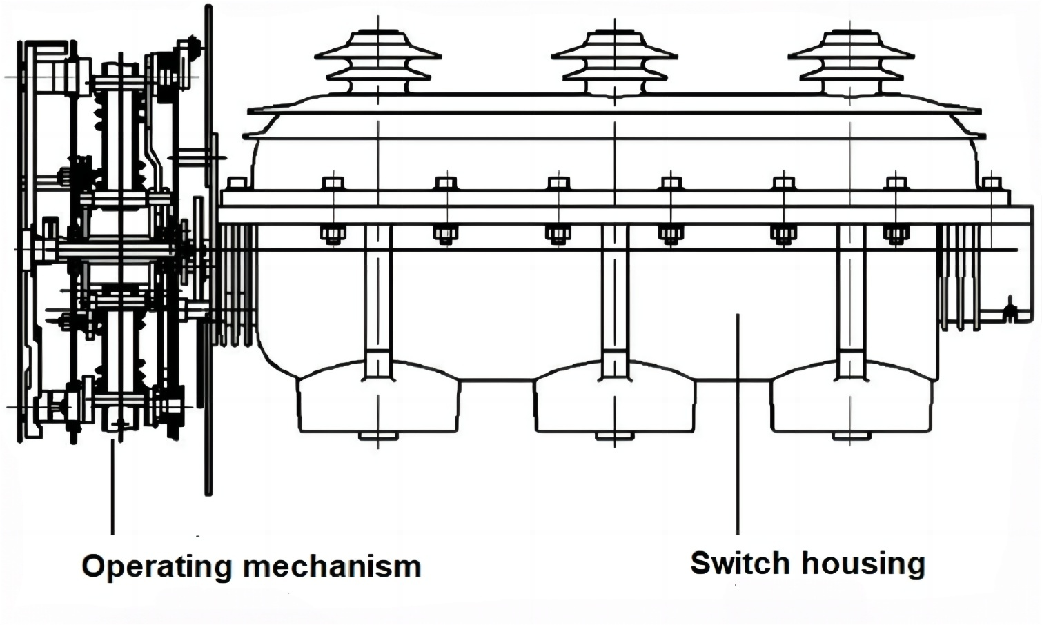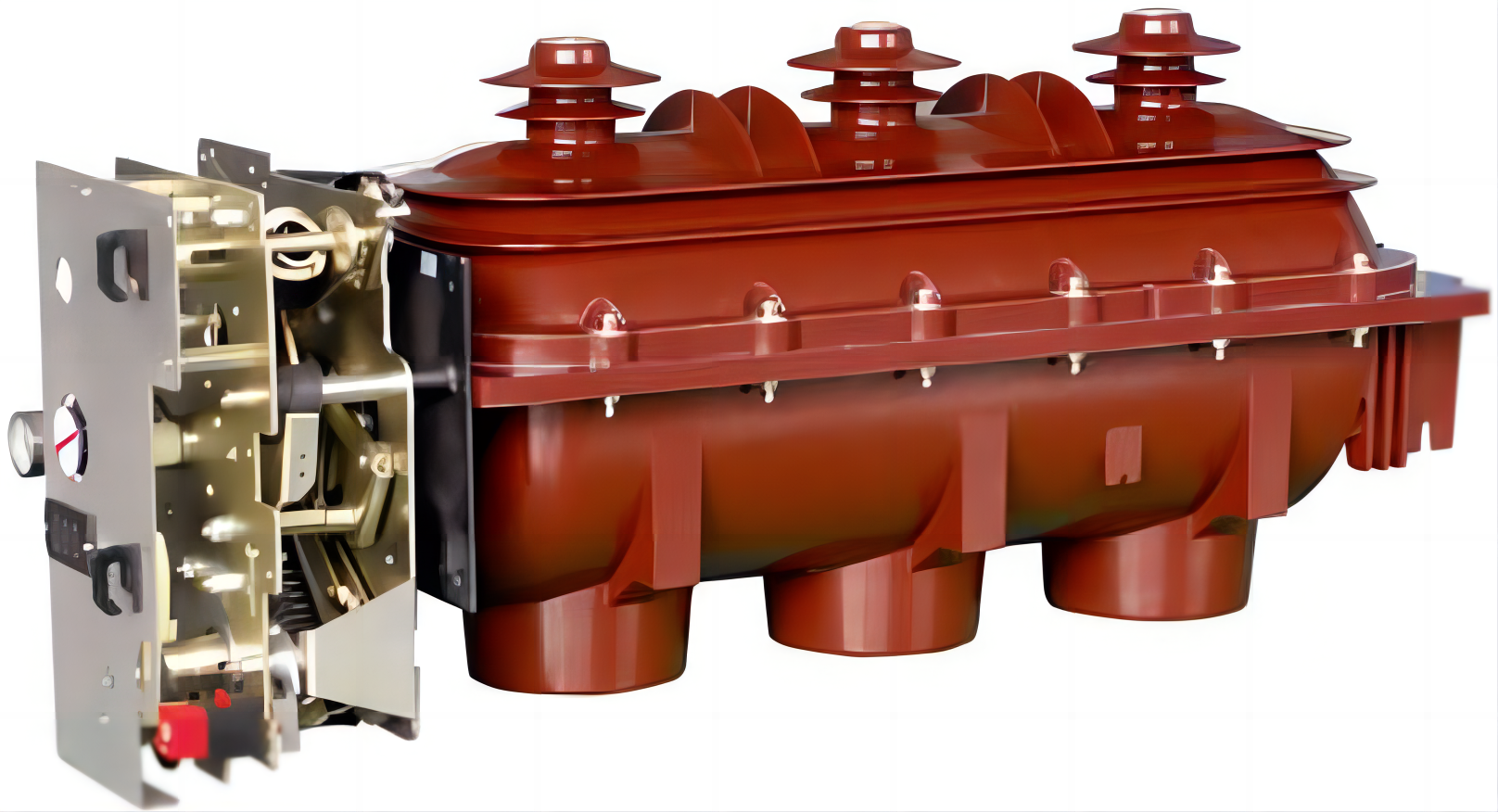- Общая герметичная конструкция: она объединяет выключатель нагрузки, разъединитель и заземляющий выключатель и герметично помещена в изоляционную коробку, заполненную элегазом SF6 с относительным давлением 0,04–0,05 МПа, и соответствует «закрытой системе давления».