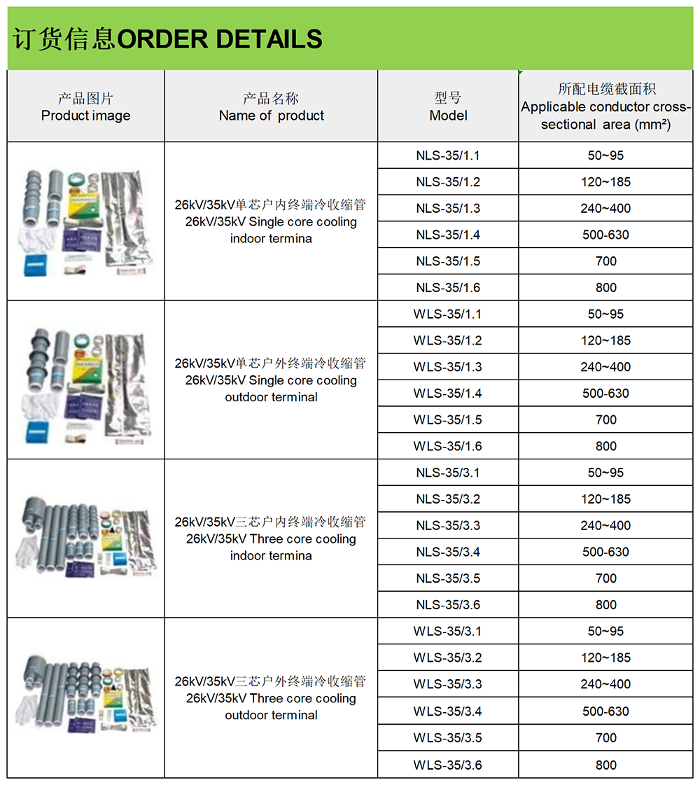 Силиконовая резина имеет отличную изоляцию и высокую эластичность, после установки остатков корпуса кабеля подходящего радиального давления, интерфейсной связи, не из-за кабельных трасс дыхания и пробоя. Часть управления напряжением и основной изоляционный композит интегрированы, что эффективно решает проблему концентрации электрического напряжения на внешней экранирующей поверхности кабеля, что обеспечивает надежность изоляции и безопасность эксплуатации. Вся продукция была изготовлена на заводе. Без специальной подготовки, простая установка и эксплуатация, и не используйте огонь, экономия времени и труда, холодная усадка с автоматической сбросной технологией, простая установка без пота, значительно снижена из-за несчастного случая качества, вызванного неправильной эксплуатацией, но также решает явление сжатия сборных кабельных аксессуаров не плотно или не входит.